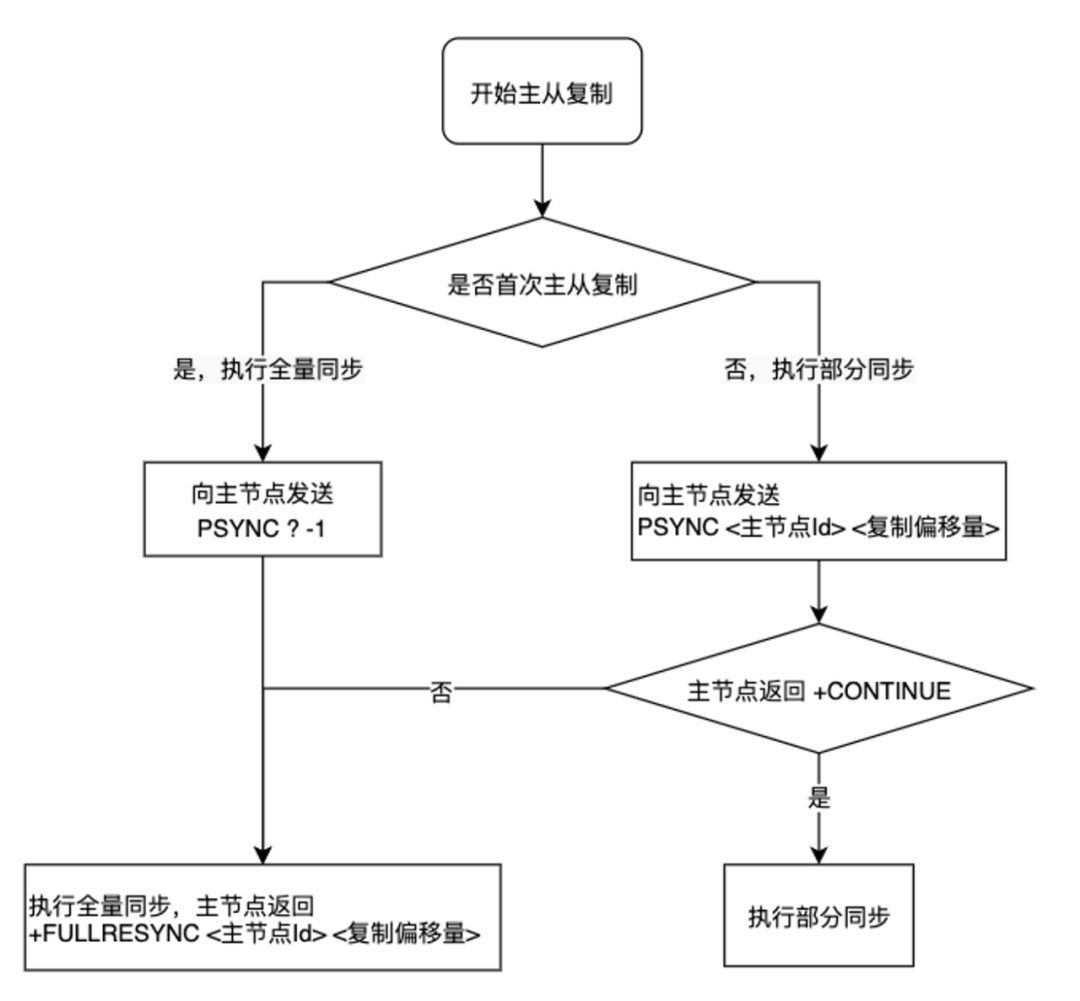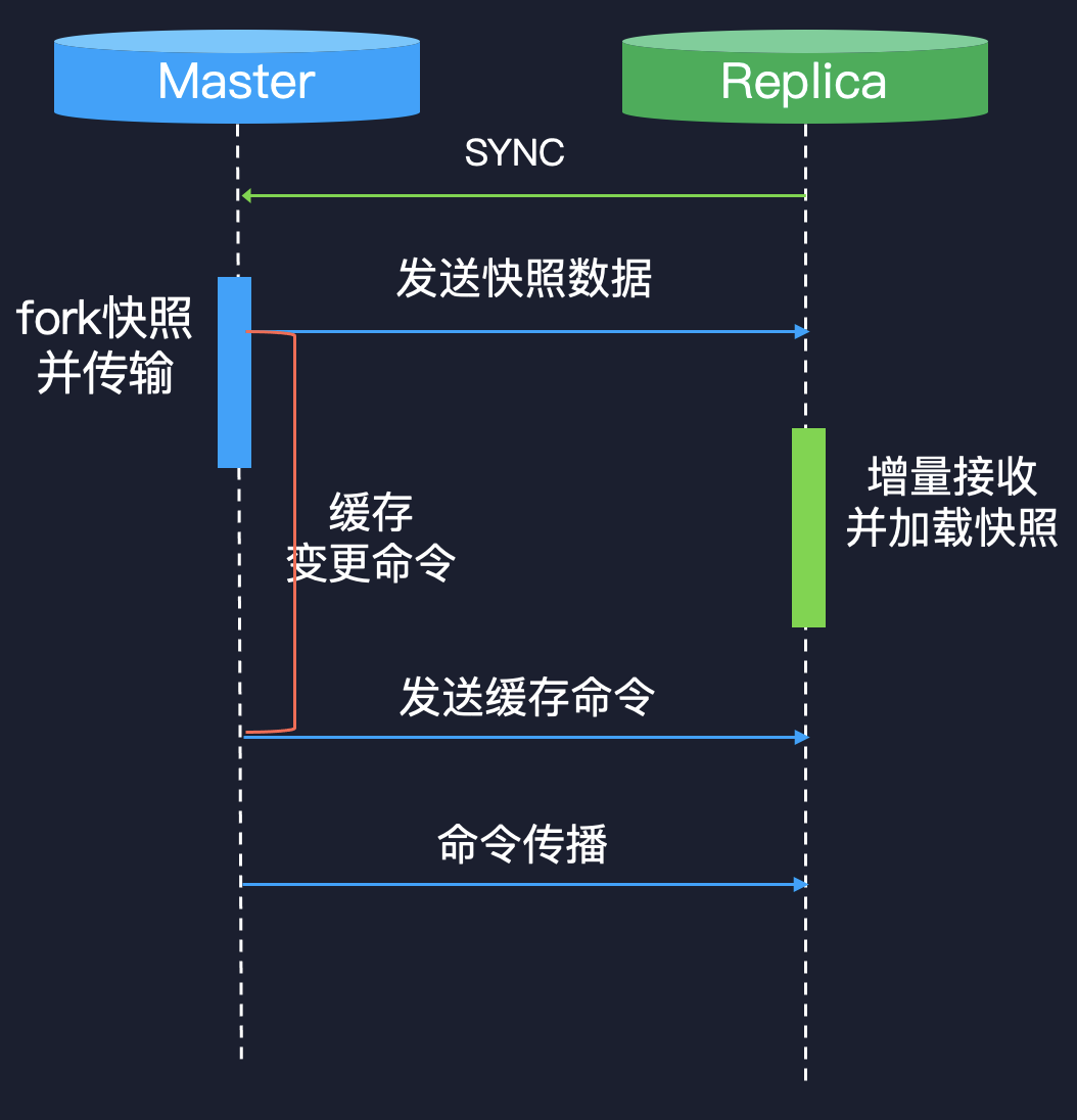 从库发送一个 SYNC 请求给主库,主库就会 fork 一个进程,产生数据快照,当这个数据快照产生完成之后发送给从库,注意这里是数据快照,产生完之后再发给从库,从库也是接收完这个快照之后再加载快照。因为在这个期间主库肯定又会积累很多命令,所以它会将缓存的命令再次发送给从库,之后就进入了一个命令的传播阶段。