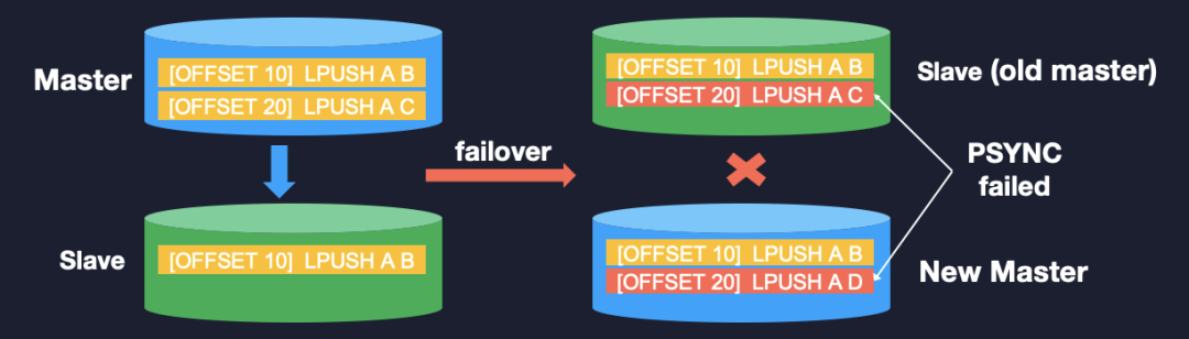 还是看一下这个例子:现在有一主一从,你在主库上写了两条数据,LPUSH A、C,但是由于同步的延迟,在从库上只有一条,就是 LPUSH A、B,当 failover 后从库成为新主,它肯定会接收新的业务请求,比如它写入了一条 LPUSH A、D,此时我们想让旧主跟新主建立主从复制,这样是可以进行增量同步的吗?