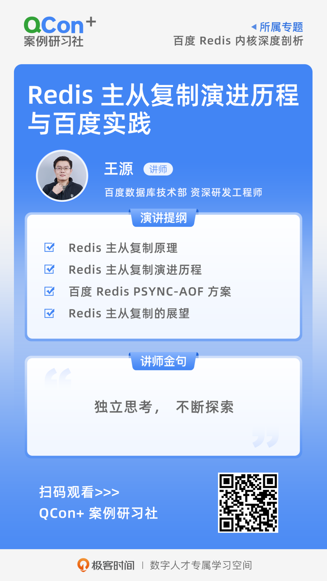 最后我有一句话和你分享:独立思考、不断探索。我们发现 Redis 主从复制的历程,也是发现问题去解决问题。我们遇到了很多问题,但是通过深挖找到解决的思路,然后去探索,最后将这个问题不断地优化得以解决,也让我们应对的场景越来越多。