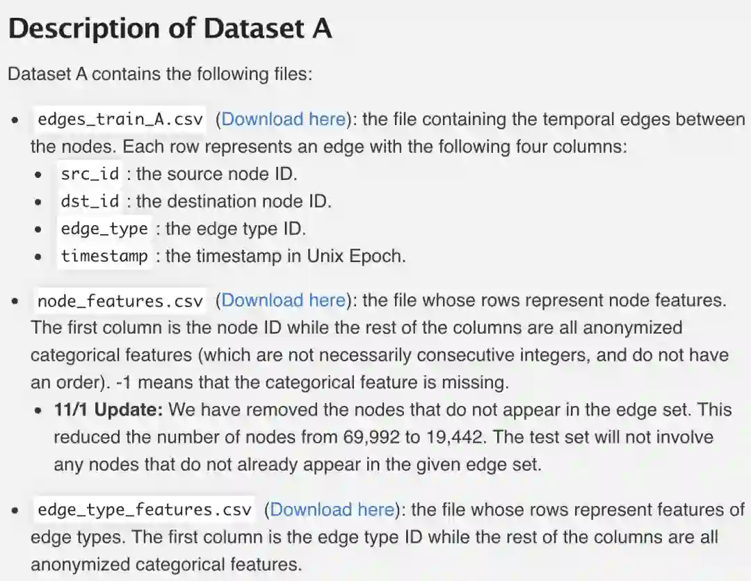 本次比赛给了2个动态图数据集A和B,一个是时间图,一个是用户-商品交互图,其边都带有时间信息。