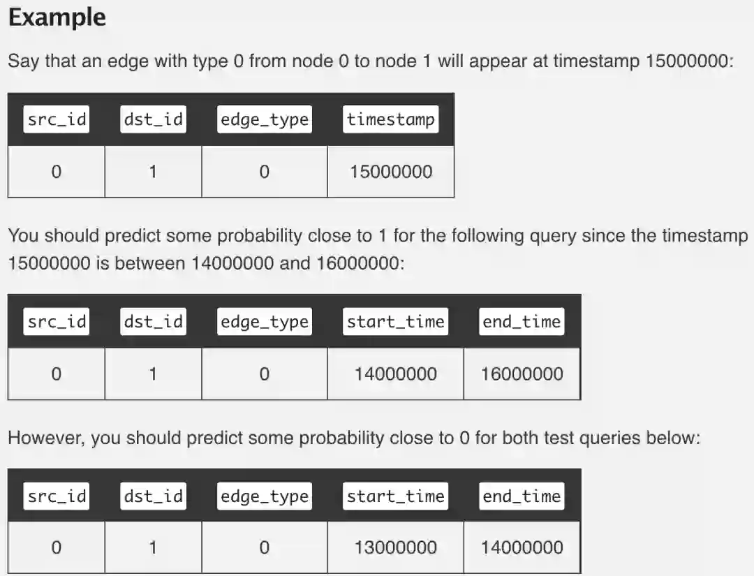 因此,本次WSDM Cup 2021首次推出了大规模时序图预测挑战。和普通的链接预测相比,时序图预测要求模型判断在给定的时间段内,两点之间是否形成连边。