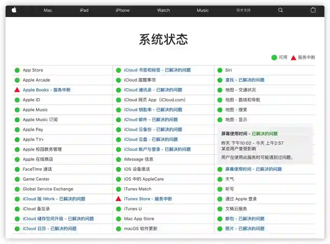 这个页面可以查询到各类苹果服务的服务器状态。最近出现问题的服务将会通过超链接来显示详情,并在曾受影响的服务旁边附加「已解决问题」的状态。点击一个超链接可以弹出一个窗口显示当前的状态、上一次问题发生的时间、受影响的用户数量以及问题对用户的影响情况。