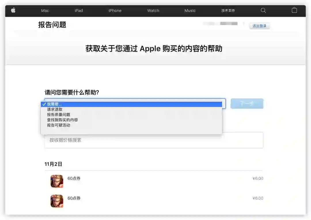 在这个页面下,你可以获取通过 App Store 购买的内容的帮助,详细到每一笔通过验证的订单,同时可以对不同订单发起退款请求、报告质量问题等操作。