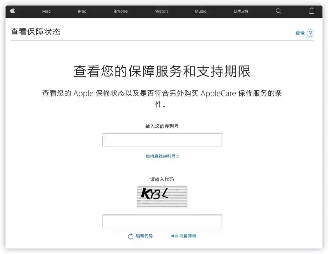 在这个页面下输入产品的序列号和验证码即可查询保修状态以及是否符合另外购买 AppleCare 保修服务的条件。