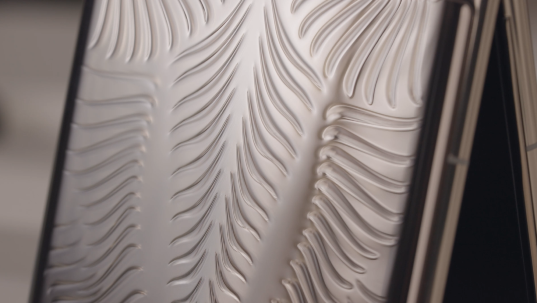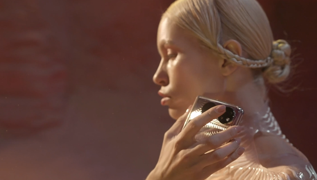 华为邀请了服装设计师 Iris Van Herpen,她将服装设计的灵动带到了手机之上,如磁场引力聚集的花纹,轻盈而有序,科技与艺术在此共生。