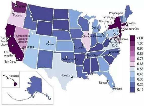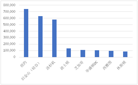 下图则是华人居住人数排名前 8 大地区;在纽约,旧金山和洛杉矶地区,都有 50~70 万华人居住在那里。