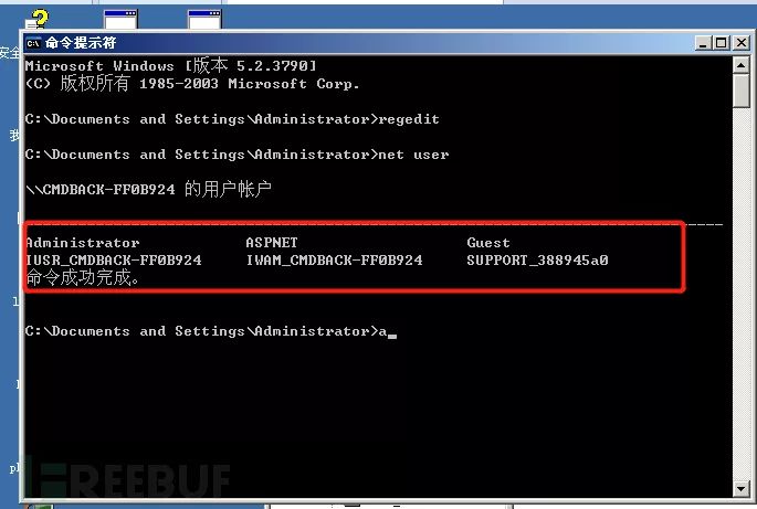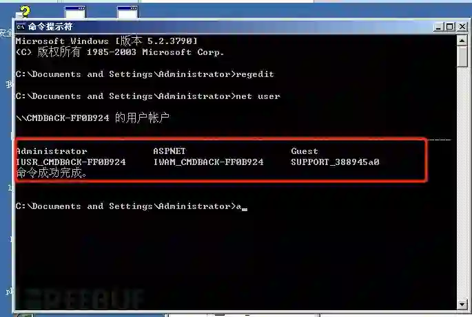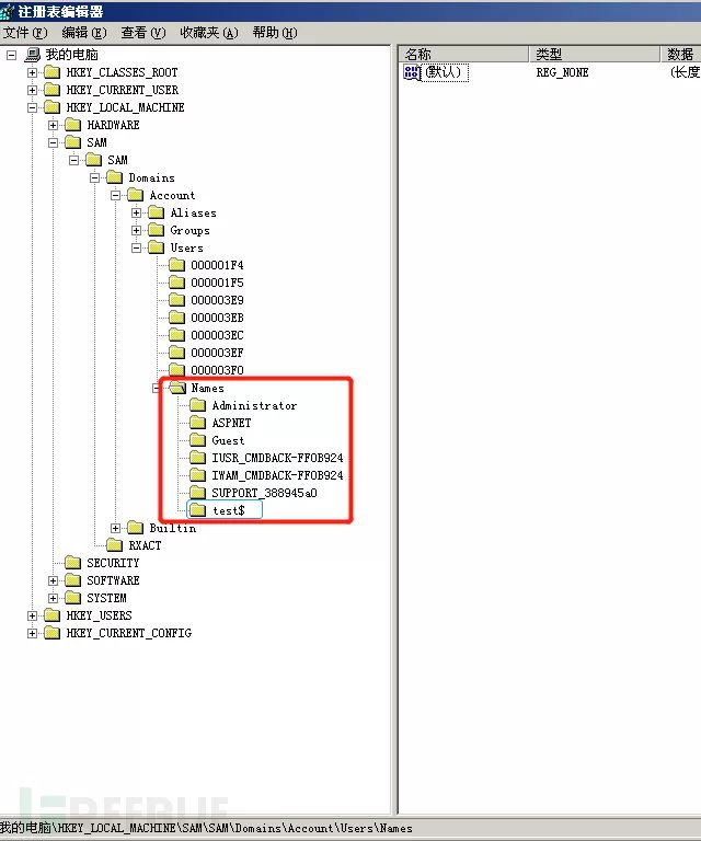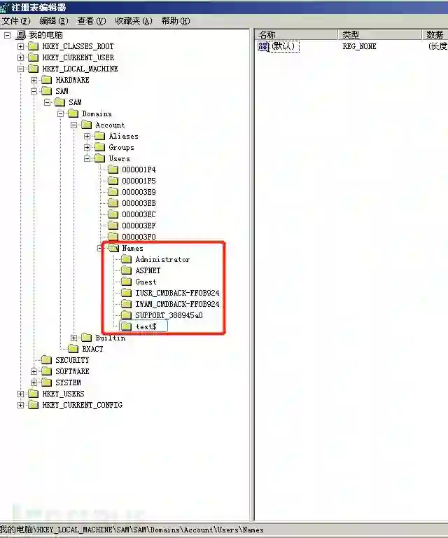像这样的隐藏账号我们用命令是查询不到的,我么只能去注册表中查看是否有隐藏账号。注册表位置在DOS命令行输regedit,找到以下位置即可:
