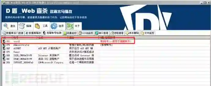 除了上述命令查询外,我们也可以利用D盾来检测一下主机中的异常信息,需要注意的是没有签名验证信息的进程、没有描述信息的进程、进程的属主、进程的路径是否合法CPU或内存资源占用长时间过高的进程等方面。提示一下,D盾是需要在联网的状态下进行的。一般管理员建立临时账号是不会建立隐藏账号的,所以一旦查出来有隐藏账号,那么就顺藤摸瓜查一下这个账户的操作日志(日志完好的情况下,这里重点提示了不仅主机要开启日志记录的功能,还要有日志审计服务器)。