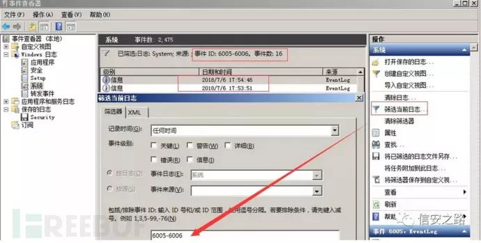 我们输入事件ID:6005-6006进行日志筛选,发现了两条在2018/7/6 17:53:51左右的记录,也就是我刚才对系统进行重启的时间。