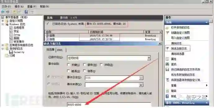 3、在系统日志右侧操作中,点击“筛选当前日志”,输入事件ID进行筛选。