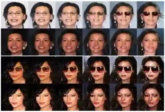 借助耦合 GAN,伪造人也可以戴上太阳镜或者佩戴珠宝首饰。但这些人脸本身仍然存在很多瑕疵,“一眼假”问题继续存在。
