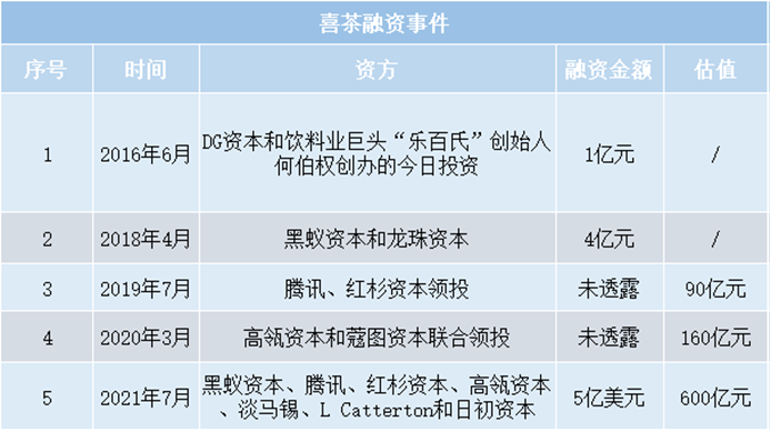 盒饭财经整理了喜茶的5轮融资情况,发现自2018年,每年喜茶都能获得一笔上亿投资,且在资方列表中,不乏IDG资本、今日资本、黑蚁资本、美团龙珠、腾讯等在内的明星投资人。
