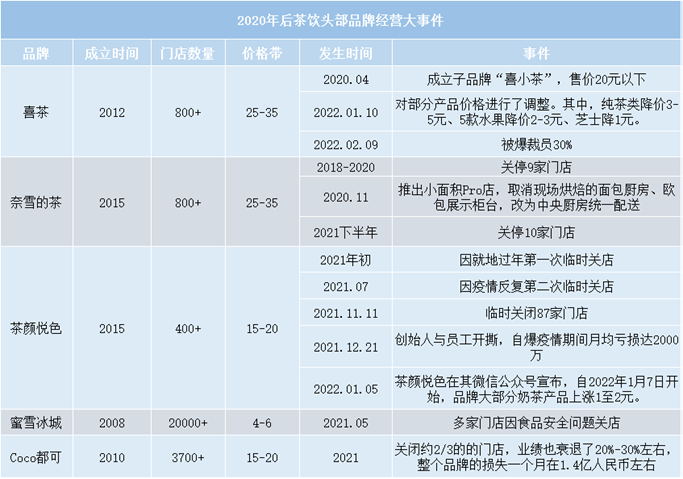 盒饭财经整理了2020年以来,几家茶饮头部品牌经营大事件,发现不同价格带的茶饮品牌,均出现关店等现象。