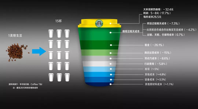 以咖啡作为类比,从《华尔街日报》披露的渣打银行统计的一杯星巴克咖啡的成本结构图来看,原材料成本占7.3%,占比最高的是租金成本及门店运营成本,分别高达26.1%和15%,而利润则为17.7%。