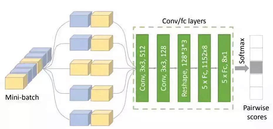 元学习模块的网络结构具体如图 3 所示。容易看出,模型从每个 mini-batch 中选出了两对六元组,每一对六元组中有两个样本来自同一类别,另外四个样本则来自不同类别。取相同类别的两个样本其中的一个作为 anchor,让它与另外五个配对组成五对数据,因此这样得出的结构就有一对类别相同的样本和四对类别不同的样本,接着在训练后,再由卷积和全连接层后对这五对数据进行分类,使模型能够选出类别相同的一对。结果证明,这种度量学习的思想对于小数据集上的增益十分明显。