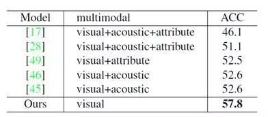 为了验证模型的扩展性,作者也在表情识别数据集上做了实验,,并在 youtube-8 数据集上取得了目前最高的精度。youtube-8 dataset 包括 1101 个视频,分为 8 种表情。从表 2 的实验结果可知,虽然作者只使用了 visual 单模态,但仍取得了准确率比其他使用更多模态 (语音和属性) 的方法高 5% 的好成绩。
