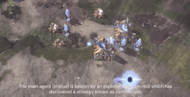 比如,蓝色是主要玩家,负责赢,红色是帮它成长的陪练。小红发现了一种cannon rush技能,小蓝没能抵挡住: