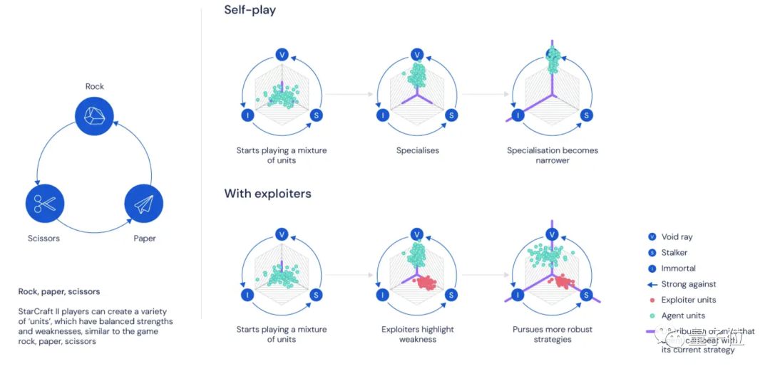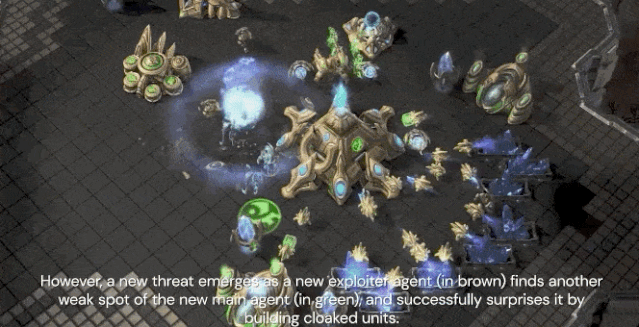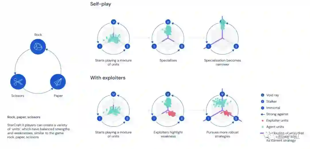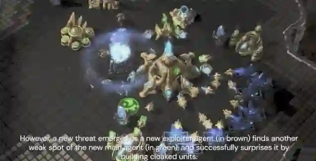 随着智能体联赛不断进行,新智能体的出生,就会出现新的反击策略 (Counter Strategies) ,来应对早期的游戏策略。