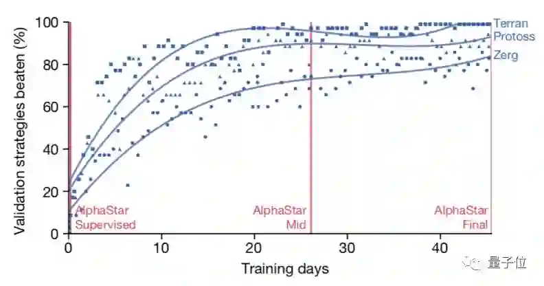 三是联赛训练完全是自动的,是从监督学习的智能体开始训练的,不是从已经强化学习过的智能体开始的。