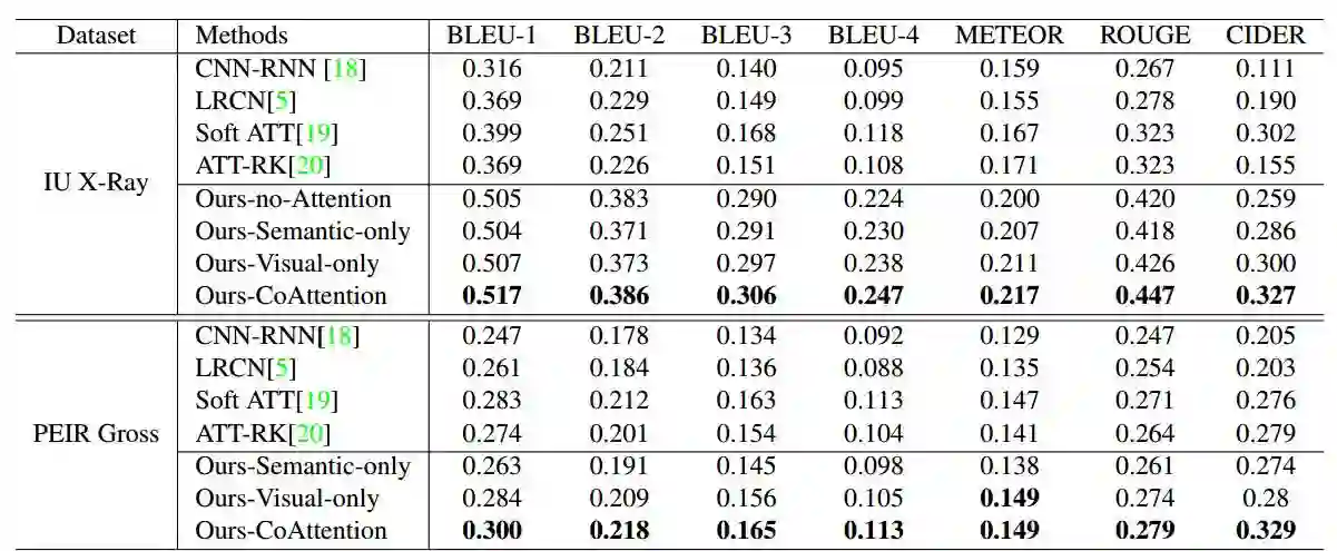 表 1. 模型在 IU X-Ray 数据集(上半 部分)上生成段落的主要结果,以及在 PEIR Gross 数据集(下半部分)上生成单语句的结果。BLUE-n 表示最多使用 n-grams 的 BLUE 分值。