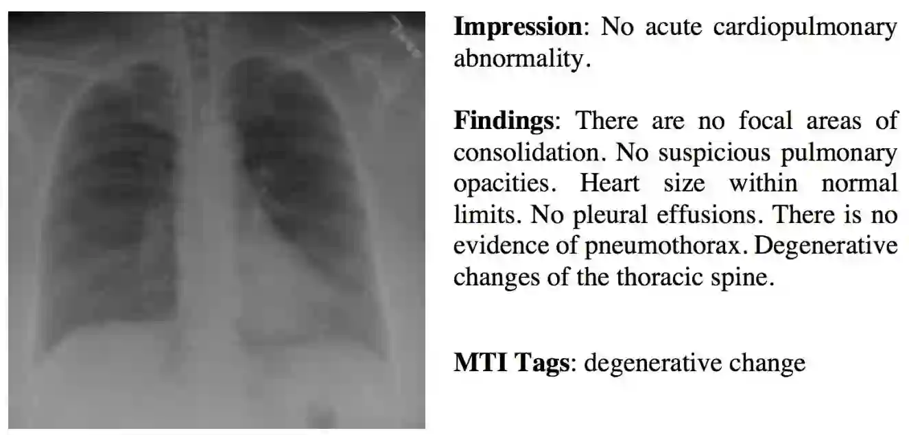 图 1. 一个包含三部分信息的胸部 X 光报告示例。在 impression 部分,放射专家结合 Findings、病人临床历史及影像学研究的指导做出诊断。Findings 部分列出了影像学检查中所检测的身体各部分放射学观察结果。Tags 部分给出了表示 Findings 核心信息的关键词。这些关键词使用医学文本索引器(MTI)进行标识。