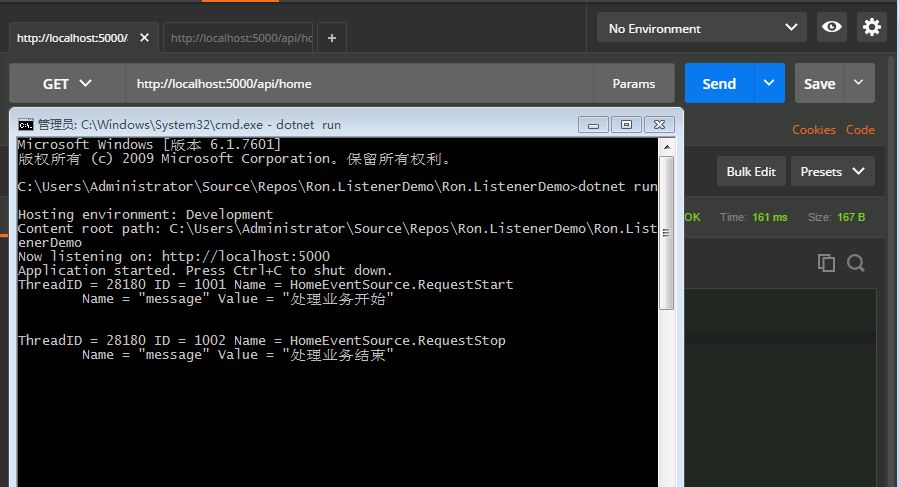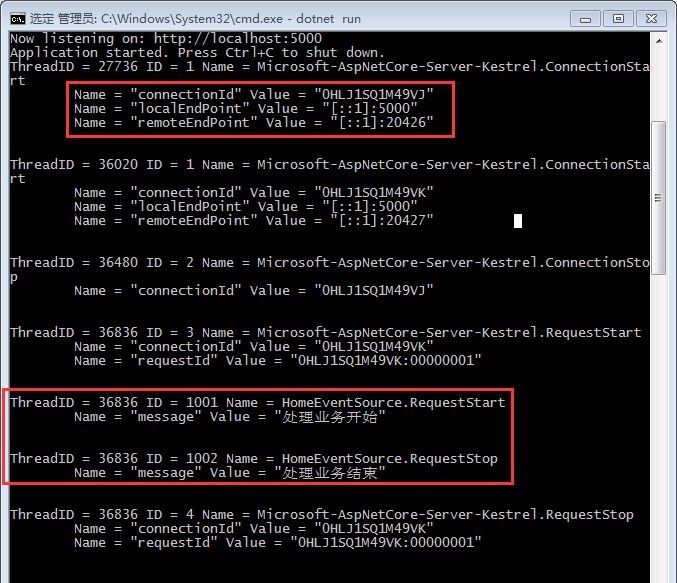 5.1、转到 HomeController,在 HomeController 的 Get 方法中使用 HomeEventSource 生产两个事件