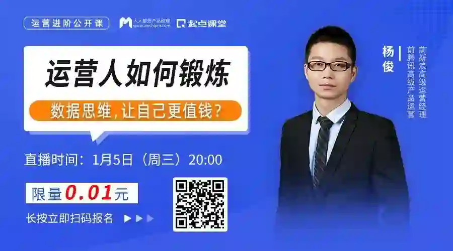 1月5日(周三)晚上8点,拥有15年运营经验@杨俊老师在线直播,用1小时教你如何锻炼数据思维,提高核心竞争力!!