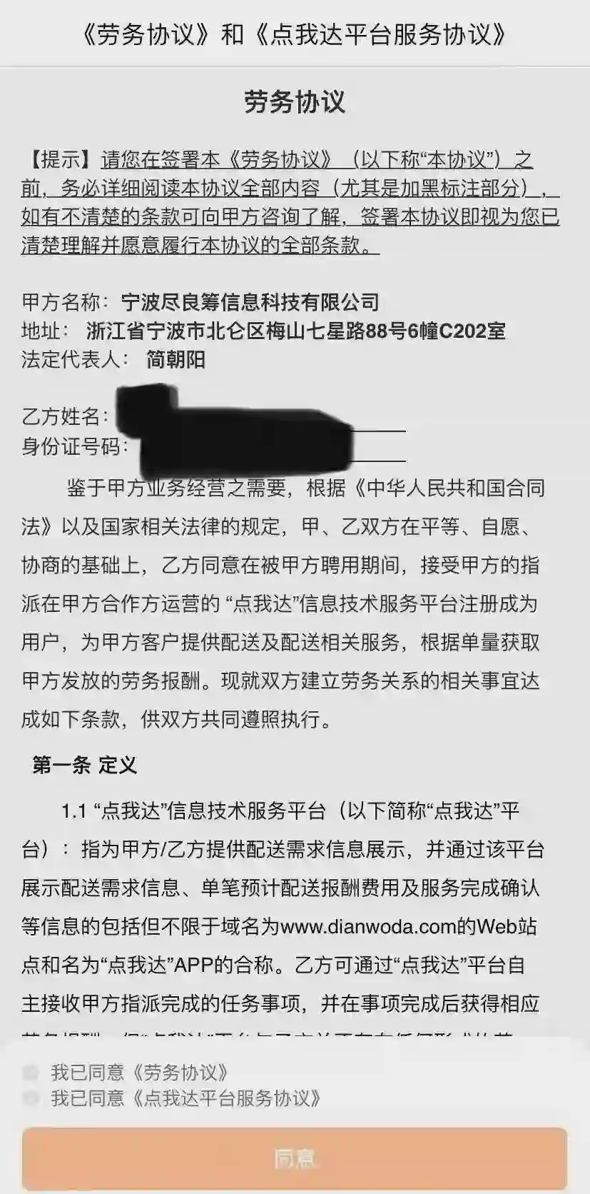 “登录后的下一个页面就是劳务协议,让我签署成为点我达众包平台下的骑手,我的身份证号和姓名一板一眼地被写在了乙方处。”