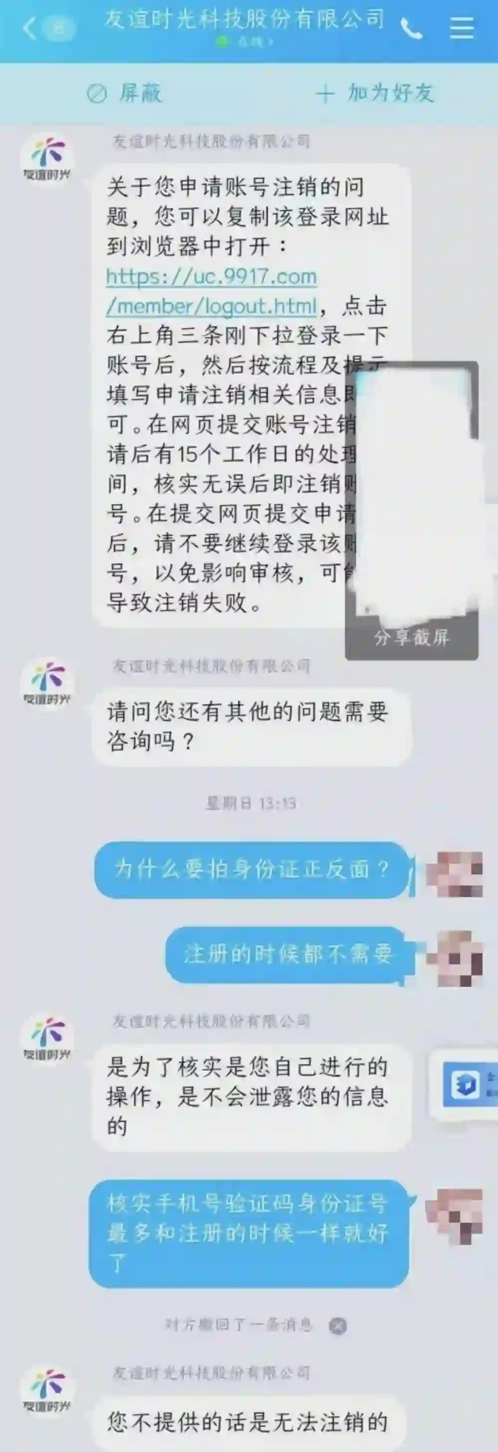 客服答复:“您不提供的话是无法注销的。”她找到微博上有同样经历的网友,对方用“好玩友”平台注销成功了,该平台和浮生为卿歌同属一家公司。