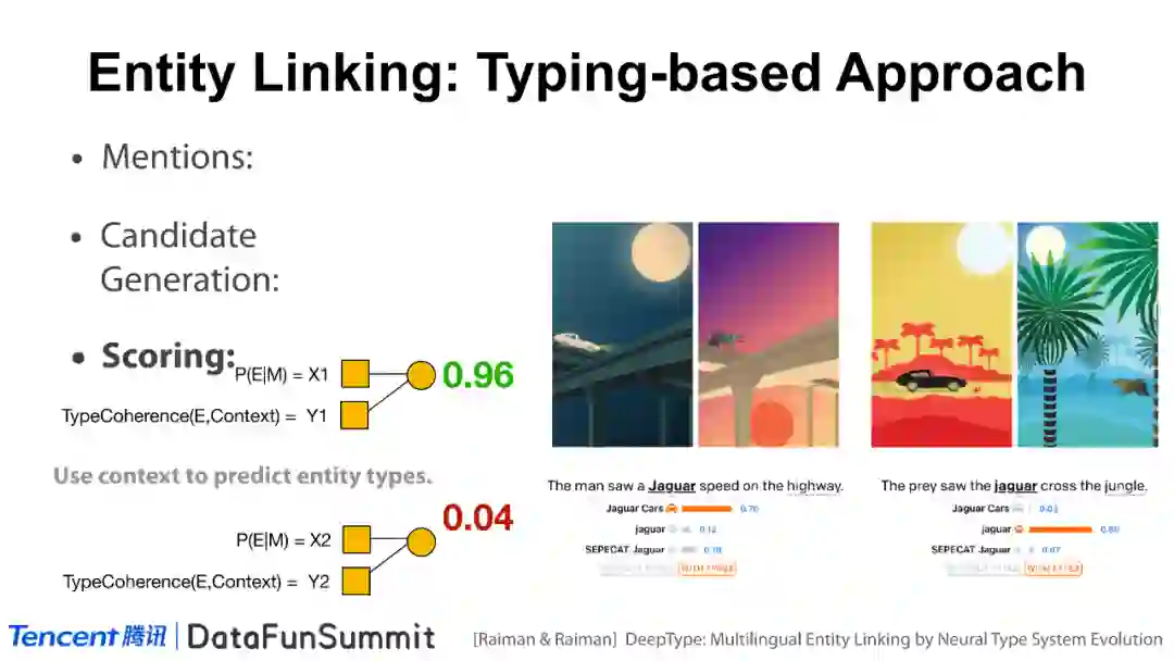 在2018年的一项工作(请见《DeepType: Multilingual Entity Linking by Neural Type System Evolution》)中提出,实体的类型是非常重要的信息,研究者可将它们用于实体链接预测。如上图(左),这句话是“一个人看见了Jaguar在告诉公路上加速”,上图(右)的这句话是:“一个猎物看见了Jaguar穿越丛林”。“Jaguar”这个词是有歧义的,它可能是一只“美洲虎”,也可能是一辆“捷豹”(即一个汽车的品牌)。在当前语境中是一目了然的,其核心思想在于:我们能否使用语境去预测实体的类别(Use context to predict entity types),然后根据类别去给定一个分数,最后结合这个词在词表中的概率去进行联合预测,即P(E|M)= X1,TypeCoherence(E, Context) = Y1。以上方法不仅简单,而且取得了较好的效果。但是,我们也可以看到,上述工作依然依赖于词表。