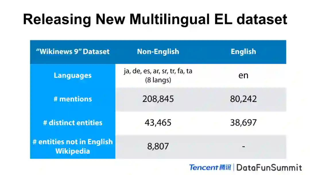 另外,在这项工作中,我们还发布了一个新的跨语言实体链接数据集(即测试集),其中包括了30万左右的mention,横跨9种语言。有8807种实体没有英文描述,是传统的基于英文的方法较难处理的一个数据集,以鼓励学术界更多的研究者投身于多语言实体链接这项任务之中。