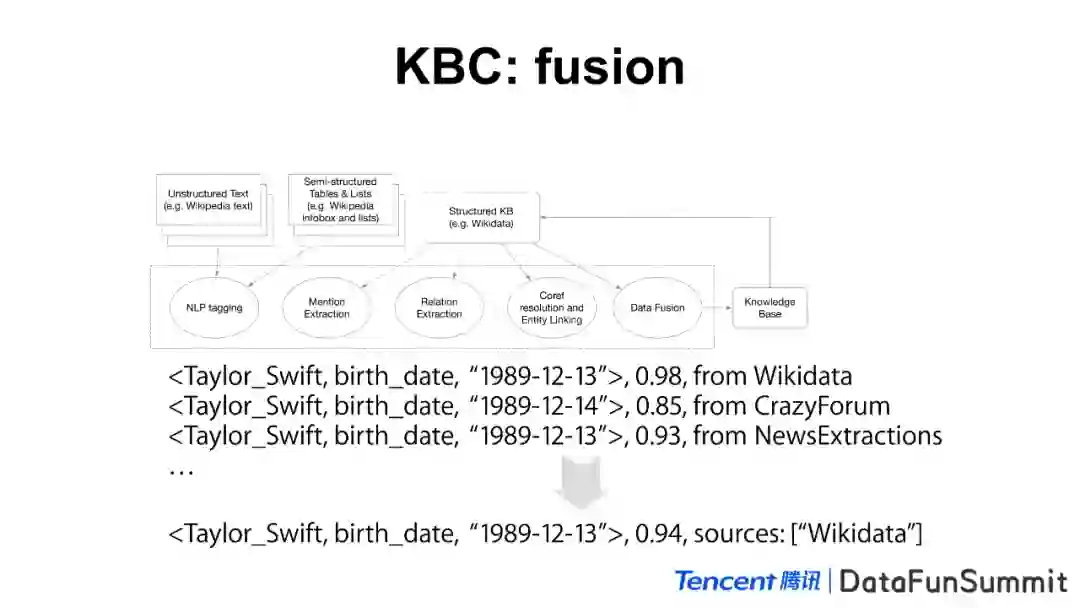 在知识融合方面,真实情况下可能会有各种有噪声的数据集,现在有很多方法致力于将它们进行干净地融合,消除一些抽取中带来的噪声。