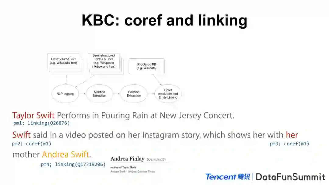 例如,通过指代消解,可以将上句话中的“Taylor Swift”、“Swift”和“her”指向同一个实体,这样做的好处在于:有利于在长文本中进行信息传递。这样,当我们抽取得到“her”和“Andrea Swift”两个实体,就可以将它们链接到正确的实体上。实体链接可以将上述这些提及链接到知识库对应的实体上。