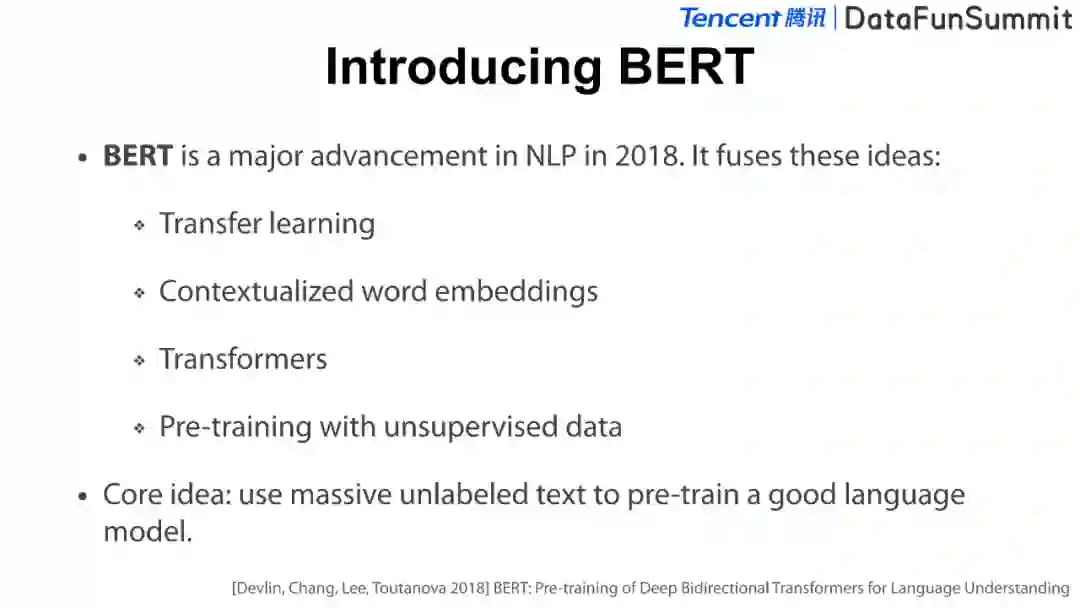 为了改进上述模型,我们不得不提到预训练语言模型BERT,BERT于2018年提出,对迁移学习(Transfer learning)、语境中的词嵌入(Contextualized word embeddings)、Transformer架构(Transformers)、大规模无监督预料下的预训练(Pre-training with unsupervised data)这几个概念进行了较好的融合。BERT的核心思想在于:能够运用大规模的无标注文本语料去预训练一个好的语言模型,又能够迁移到很多下游任务当中。