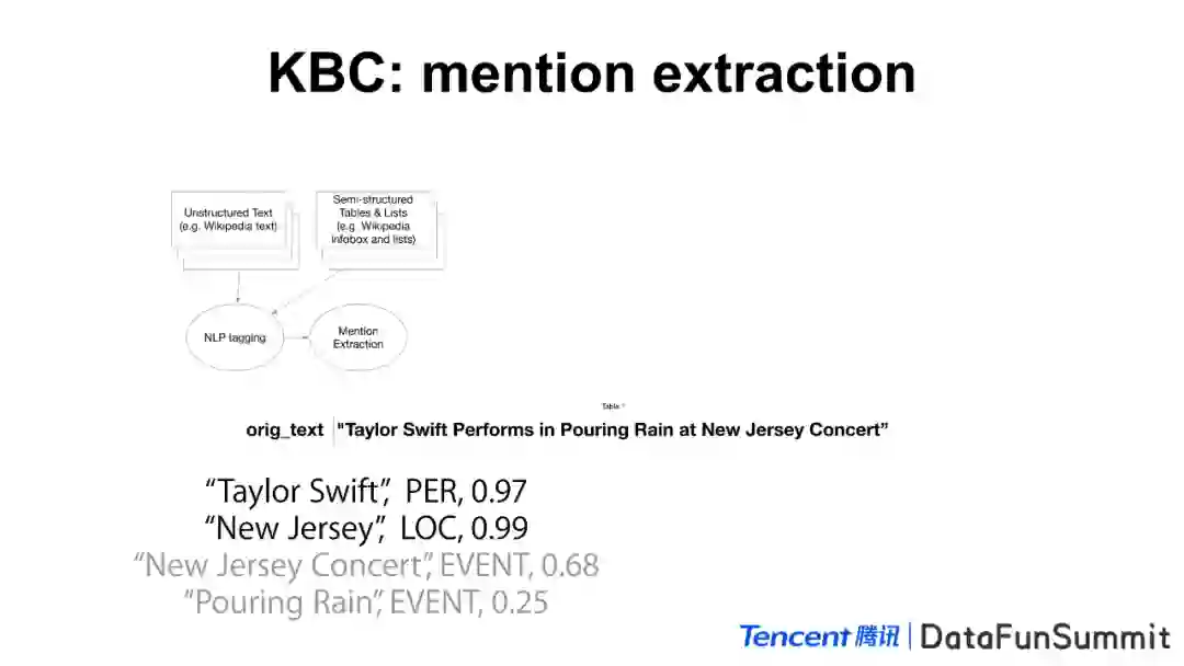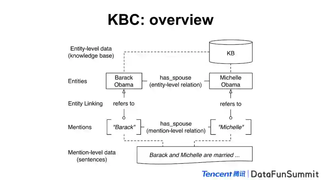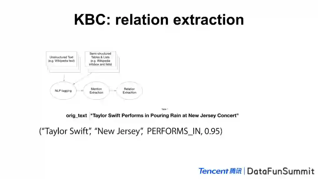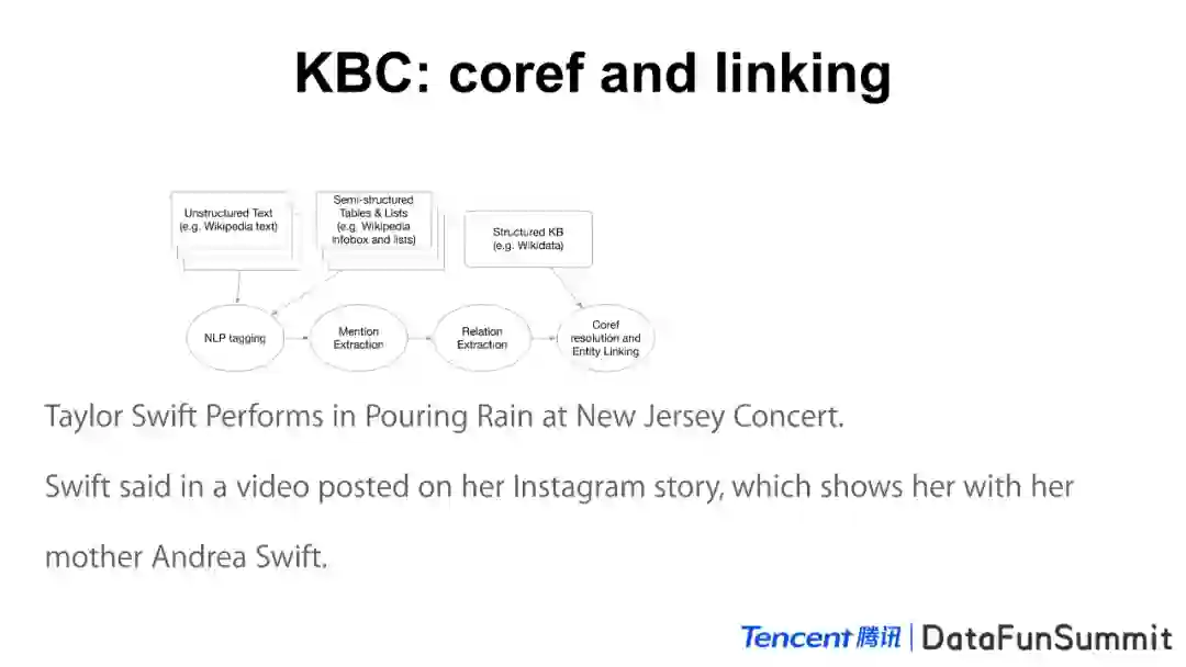上图只是知识库构建过程中的一个核心部分,包含了从句子数据中去抽取mentions,即命名实体识别、mention之间的关系抽取,以及实体链接。然后,把实体之间的关系输入到知识库中,生成新的三元组。当然还有更多的技术,如实体发现、实体对齐等,它们并没有在这张图中进行展示。