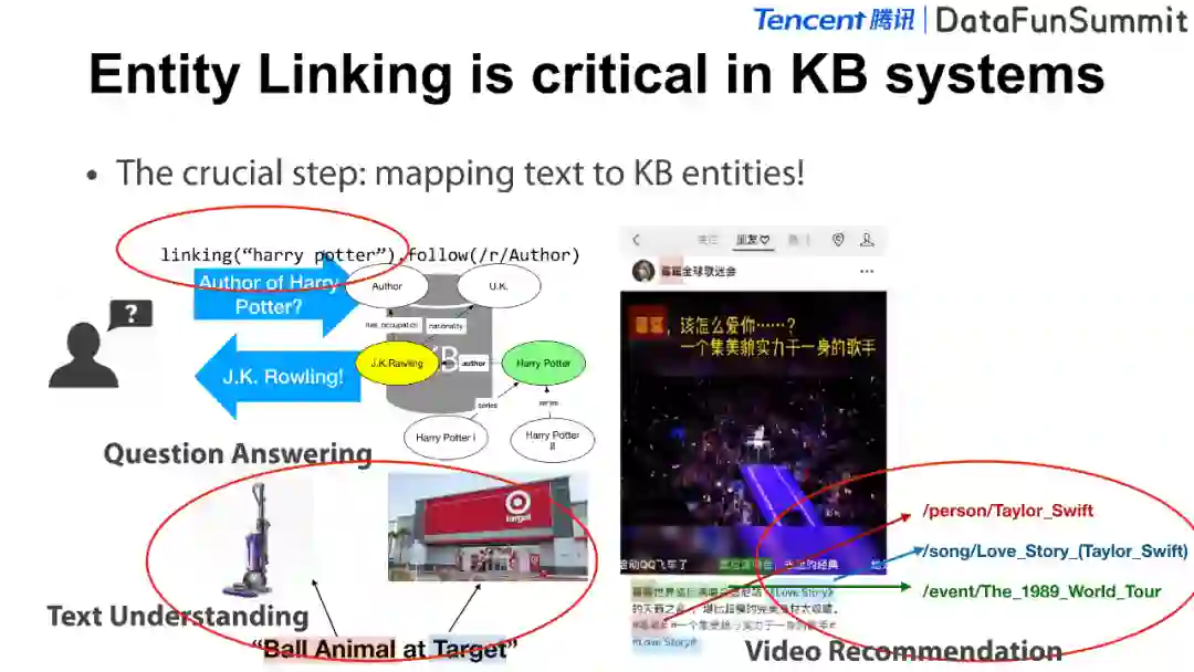 如上图所示,通过挖掘用户点过“赞”的视频,这个视频有其文本描述信息,如果能将这些文本中准确地映射到知识库中,例如,这里的“霉霉”其实是说泰勒·斯威夫特(女歌手)(/person/Taylor_Swift),“世界巡回演唱会”指的是1989年的World_Tour(/event/The_1989_World_Tour),“Love Story”是她的一首歌(/song/Love_Story_(Taylor_Swift))等等。如果能够发现这些文本与实体之间的关联,那么我们就能在相应的知识图谱上做一定的扩展。例如,我们可以给用户推荐泰勒·斯威夫特的其它演唱会的视频,以及与她相似的其它歌手的视频等等。如此,这个推荐系统就具有比较好的多样性与可解释性。上述为一个简单的应用思路,近期也有很多论文探索知识图谱在推荐中的应用,大家感兴趣的话可以去阅读。