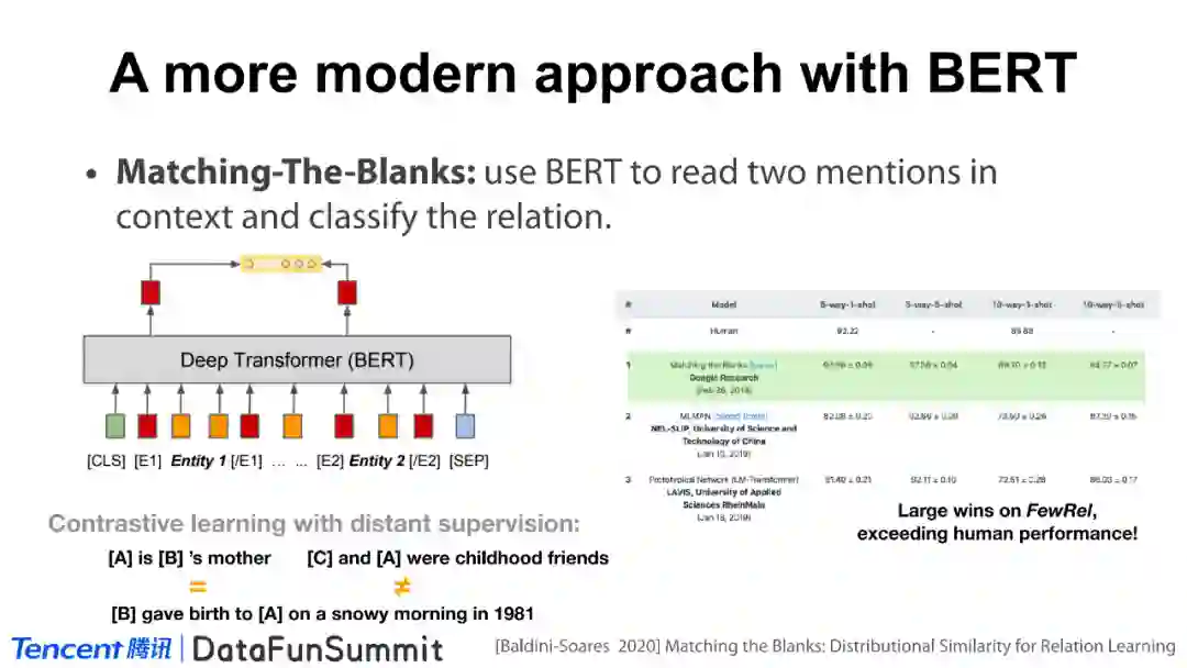 这里讲一个在关系抽取任务上比较新的方法,被称为Matching-The-Blanks。主要是对一句话中的两个提及进行关系分类,我们用BERT去编码这两个提及所在的语境,然后使用实体的嵌入表示进行分类。在该文中,用到了基于远程监督的对比学习(contrastive learning with distant supervision),例如在上图的例子中,通过阅读包含实体A和实体B的两句话,以及包含实体A和实体C的一句话,让模型去判别哪两句话表示的同一种关系。感兴趣的朋友们可以去阅读《Matching the Blanks: Distributional Similarity for Relation Learning》这篇文章。这项工作是当前小样本关系抽取任务的最好结果,甚至比人工的分类性能还高。