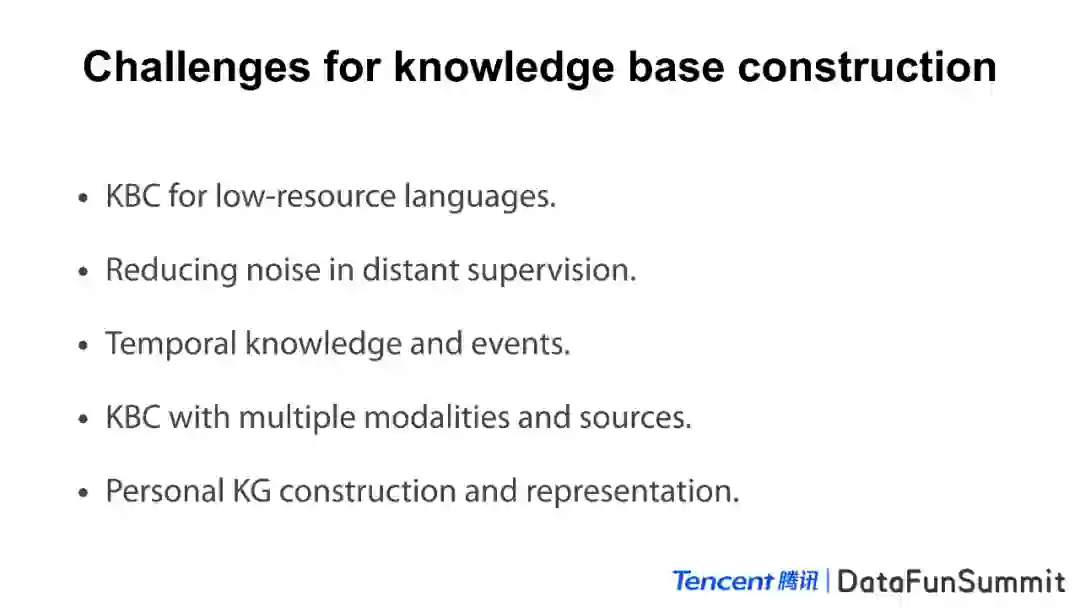 知识库的构建也有很多未解之谜,例如,低资源知识库的构建(KBC for low-resource languages),如何对远程监督的数据进行去噪(Temporal knowledge and events),时序知识库的构建以及事件的抽取(Temporal knowledge and events),基于多种模态以及数据源融合的知识库构建(KBC with multiple modalities and sources),垂域知识图谱构建与表示(Vertical KG construction and representation)。