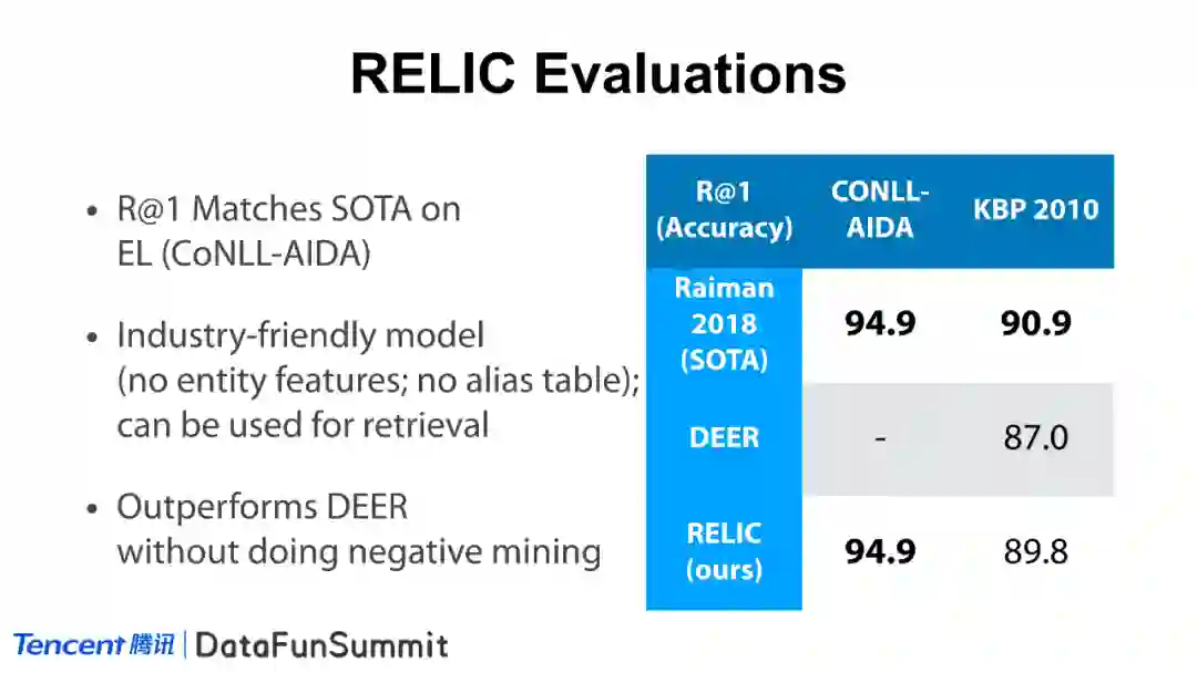 如上图,该模型的架构直观,也是一个双塔模型,左边是用BERT去编码mention所在的语境,右边是为实体学习其专有的嵌入表示。我们将这个方法称为RELIC(Representations of Entities Learned In Context),即从上下文语境中学习实体的表示。在训练模型时,我们使用的是批量软最大化损失函数(Batch Softmax loss)。