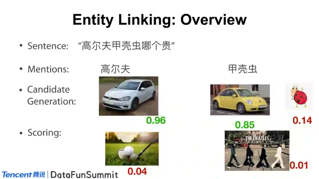 这里先给实体链接下一个定义:给定一段文本,并从中找出知识库中的实体。例如,从“高尔夫甲壳虫哪个贵”这句话中应该能识别出两个实体,即大众高尔夫(/wiki/大众高尔夫)和大众新甲壳虫(/wiki/大众新甲壳虫),这就是实体链接需要解决的问题。