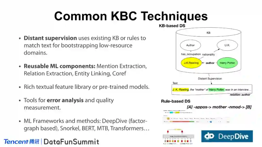 在常用的知识库构建技术中,远程监督(或称为弱监督学习)一般的思路是,利用已有的知识库,一系列文本匹配的规则,语境模板等快速地在文本中去构建训练样本。尤其是在低资源、垂直领域的环境下,普遍采用这种方法,这样可以有效地降低人工标注训练样本的成本。在知识库的构建过程中,常用的组件有:指称项抽取(mention extraction)、关系抽取(relation extraction)、实体链接(entity linking)、指代消解(Coref) 等共性的机器学习组件。当然,工具也是很重要的,在领域上我们需要对模型进行迭代,对于某一版模型的抽取结果而言,我们需要对其进行分析并明确改进的地方。最后是机器学习的框架和方法,例如DeepDive(一个基于概率图模型的工具),Snorkel,BERT,MTB,Transformers等。