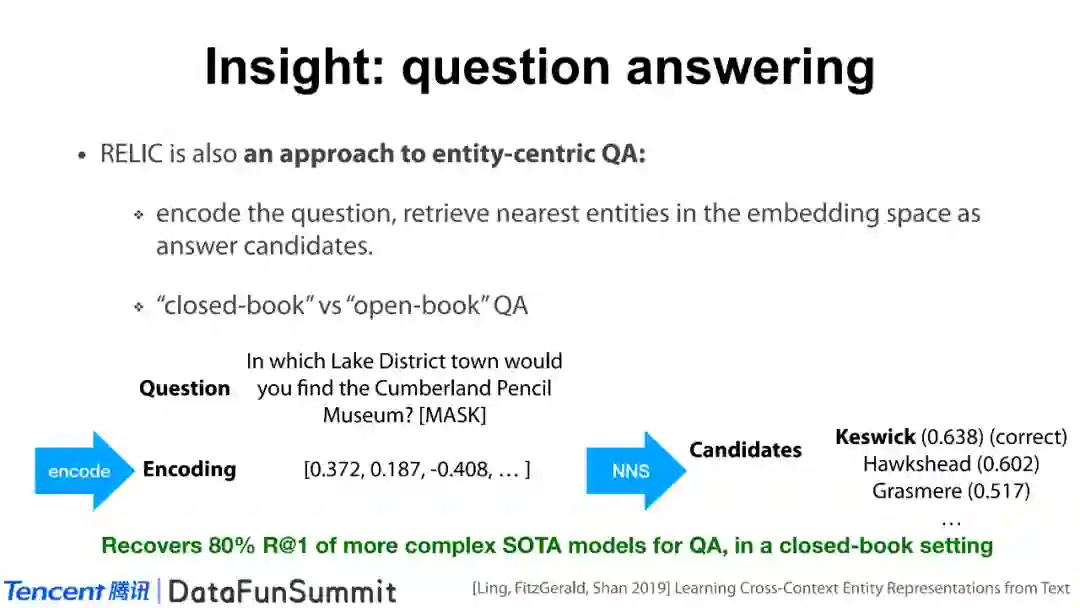 另外,我们还获得了新的发现:该方法训练得到的实体嵌入表示还能做智能问答。怎么做呢?以上图为例,我们将“In which Lake District town would you find the Cumberland Pencil Museum(坎伯兰铅笔博物馆在哪个城市)?”这个问题直接进行编码后在向量空间中搜索,得到的答案即为坎伯兰铅笔博物馆所在的城市——凯瑟克(Keswick)。类似于闭卷问答(closed-book)的定义,就是说模型不去获取相关的文本,而是通过记忆来回答相关的问题。相较于开卷问答(open-book)中的最好方法,该方法在召回率上达到了80%。