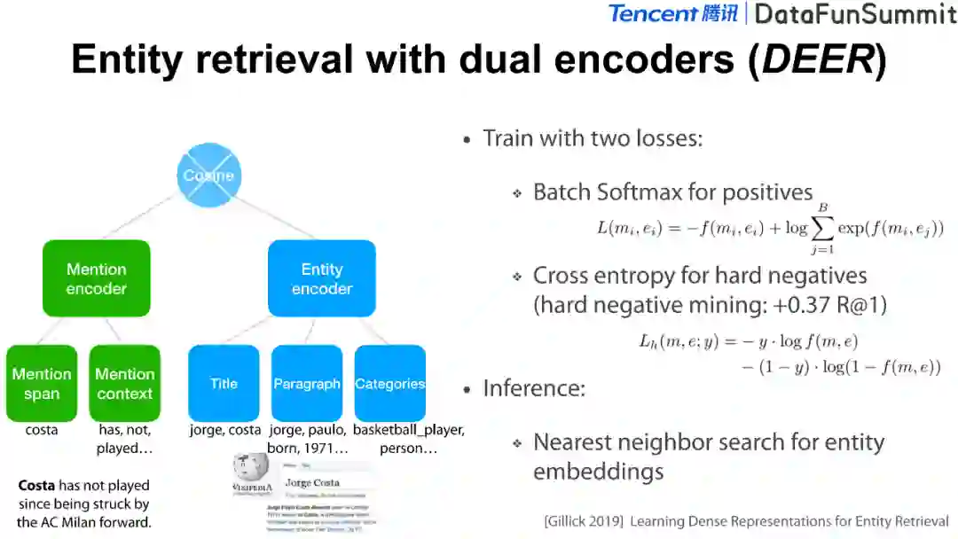要减轻实体链接对词表的依赖,一个有效的方法被称为:深度召回(Deep Retrieval)。该方法的主要思路是,不在依赖于这种词表,我们可通过深度学习模型学习到这样的映射,然后将最有可能的实体候选项作为该模型的结果进行召回。具体的做法是,将语境中的实体词当成是向量表示,然后在向量空间中进行检索,找到与它最近的候选项。这里举个例子,如上图,在“Costa has not played since being struck by the AC Milan forward(Costa在AC米兰这场比赛后就再没有打过了).”这句话中,我们将这句话编码为一个向量[0.135, -0.047, 0.028, …],然后在一个向量空间中搜索,从图中可知,mention的向量附近的往往就是一些很匹配的实体(如Jorge_Costa, Ricardo_Costa等)。最后召回的结果中排名第一的就是Ricardo_Costa,即为链接的正确答案。