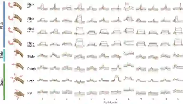 我们收集了 12 位新参与者的数据,共得到 864 个手势样本(每人各做八个手势,重复九次),每个样本有 16 个特征,随时间线性插值得到 80 个观察结果。参与者按自己的风格做八个手势(不提供反馈),这是因为我们想要适应个体差异,毕竟分类高度依赖于用户风格(“接触”)、偏好(“捏/抓的方式”)和个体差异(如手掌大小)。为此,我们专门为依赖于用户的训练设计了流水线,以便涵盖不同参与者之间的个体风格差异,例如对顺时针/逆时针的使用不一致、表示时间的手势中存在重叠(例如,轻弹与轻弹和握住,以及类似的捏和抓手势)。对于不依赖用户的系统,我们需要解决如下差异:更严格的一致性说明,来自更大人群的数据,以及更多样化的环境等。训练期间的实时反馈将有助于减少差异,因为用户会学习调整其行为。