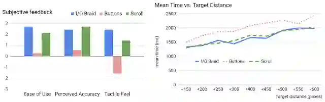 左:经过加权平均处理的主观反馈。我们将李克特 7 点量表映射成 [-3, 3] 范围内的分数,并乘以技巧得到该评分的次数,然后计算所有得分的平均值。右:目标距离的平均完成时间显示按钮的速度一直较慢