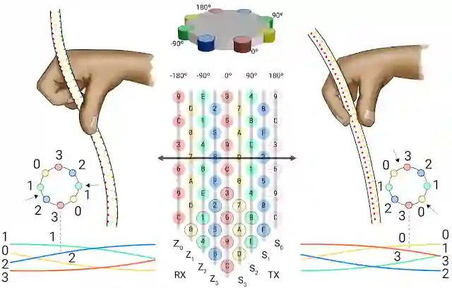 左:基于 4×4 线状编织物(核心四周围绕了 8 根导电线)的螺旋感应矩阵。洋红色/蓝绿色的是导电纱线,发挥接收/传输作用。灰色的是纱线(棉质);中:矩阵横截面图,展示了无数个 4×4 矩阵 (彩色圆圈 0-F),这种模式在整条细绳上重复;右:黄色的是光纤线,负责提供视觉反馈