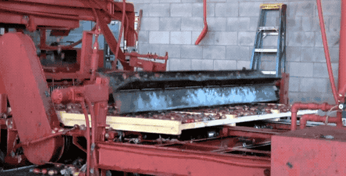 接着在运输中的托盘,上方有转动的浆片把西梅再给铺平。