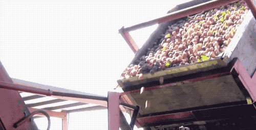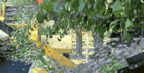 西梅是长在树上的,丰收的时候密密麻麻长满了枝桠。收获机摇动树干,哗啦啦地落满在传送带上,一条龙地收集到一起。注意看啊,这里的西梅都还是新鲜采收的。