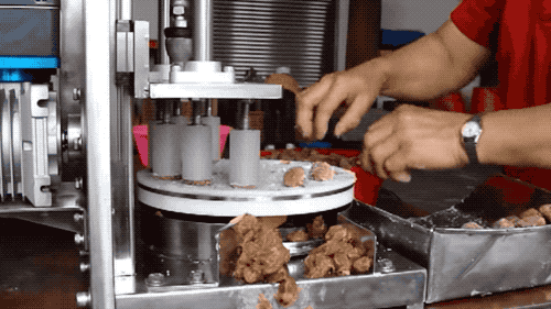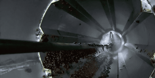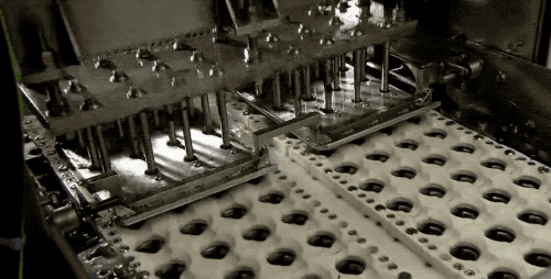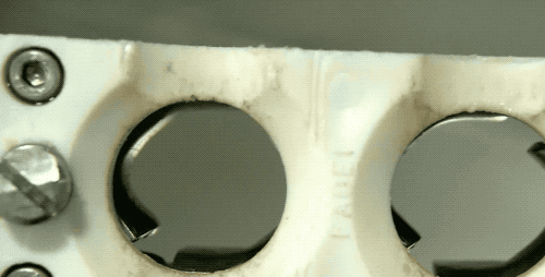接着来一个小孔上方的视角:上面的去核刀具直接压下来,就把梅子的核捅下去了,在这一瞬间,梅肉还被夹在钳子上挤压着刀具呢。整个联动后,一配合起来,是十分迅速地一联排果核就去掉了。