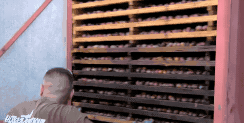层层摞高,送去高温烘干 16 个小时,西梅的含水量就能从 80% 下降到 19% 了。